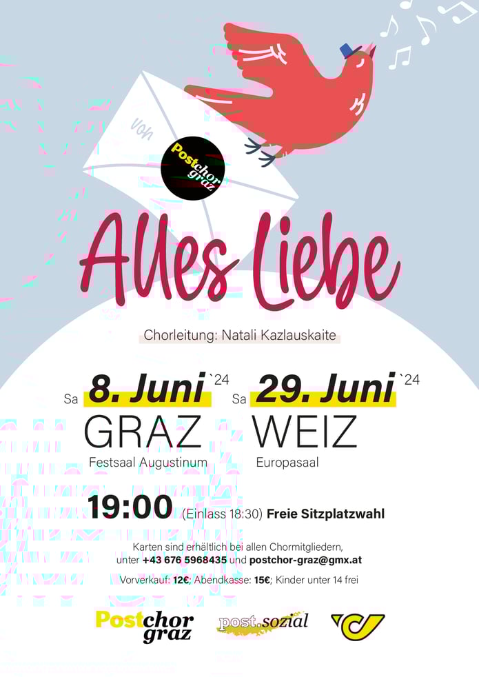 Karten gibt es bei allen Chormitgliedern, über postchor-graz@gmx.at und +436765968435, sowie +43664884455584.